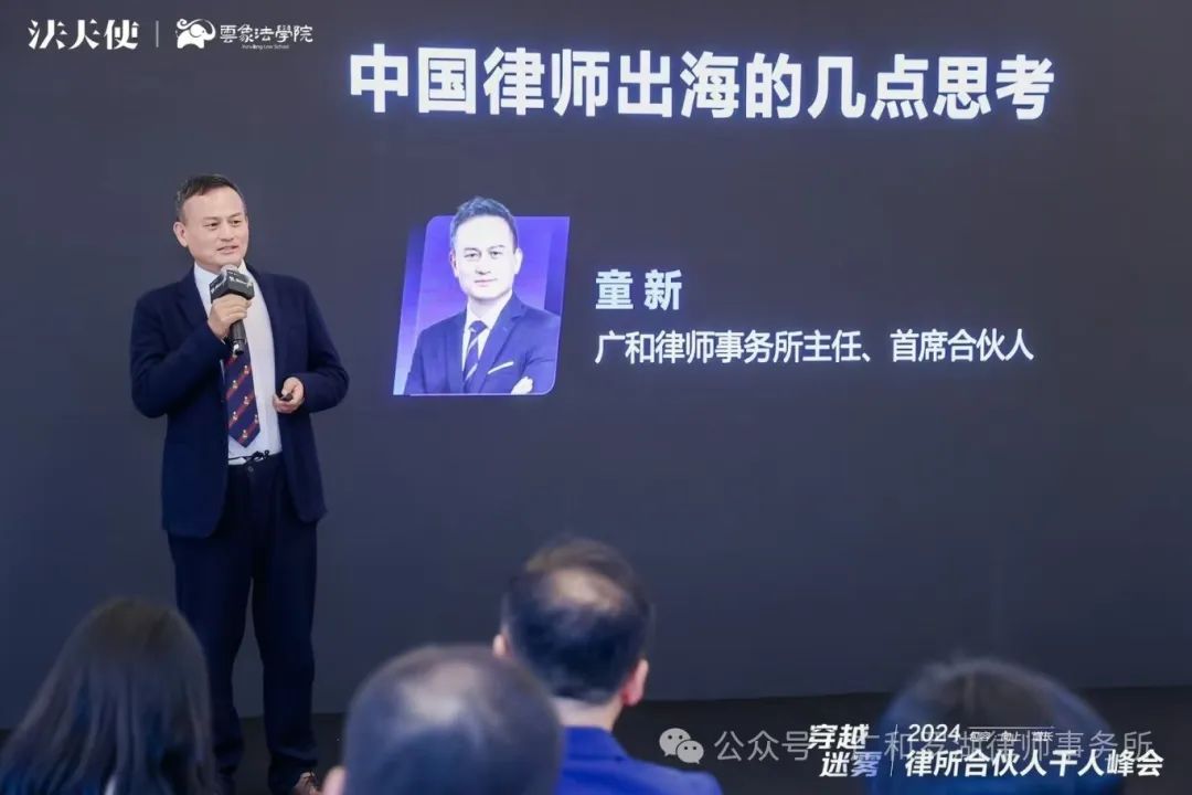 2024年律所合伙人千人峰会特设“出海论坛”,律师行业超级大咖聚焦出海议题分享各自见解。广和律所主任童新分享《中国律师出海的几点思考》主题演讲。